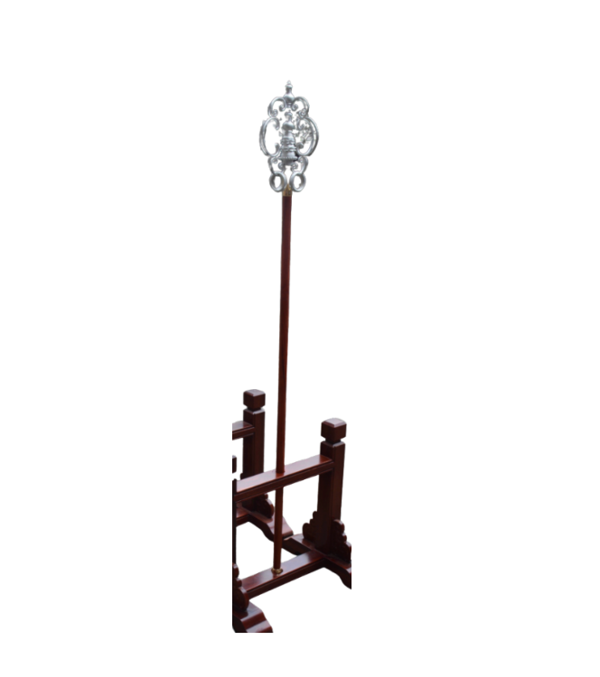 格調高い装飾が施された伝統的な錫杖です。 銀色の繊細な渦巻き模様が特徴で、杖としての実用性と芸術性を兼ね備えています。 木製の持ち手と金属部分のコントラストが美しく、神事や儀式にも相応しい風格があります。 杖本来の支えとしての機能だけでなく、空間に荘厳さを与える錫杖としての存在感を放ちます。