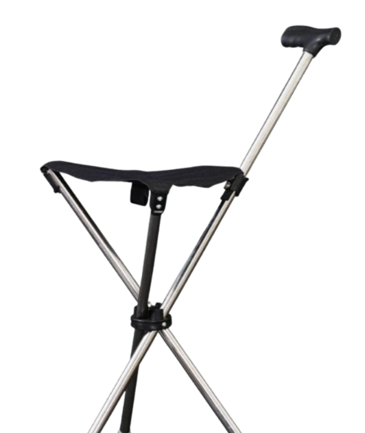 伸縮自在の杖部分は高さ調整が可能で、外出先での休憩時には三脚式の椅子として使用できます。