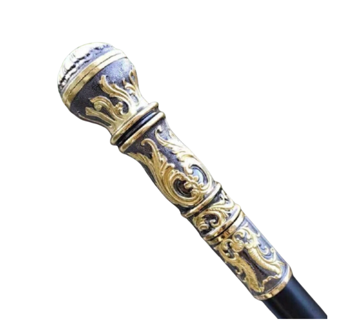 黒地に金の唐草模様を施した球体グリップと、繊細な彫刻装飾が特徴的な逸品。
